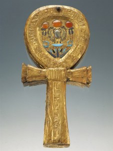 1. King Tut’Ankh’Amun’s gilded ankh-shaped mirror case ~ One of the best-known ancient symbols that is often depicted in the firm grip of a Khemetic deity’s hand is the ankh. With its feminine oval and masculine crucifix, the ankh represents what the ancients regarded as the key of life. When used in hieroglyphic writing, the ankh may mean “mirror,” “floral bouquet,” and/or “life.”