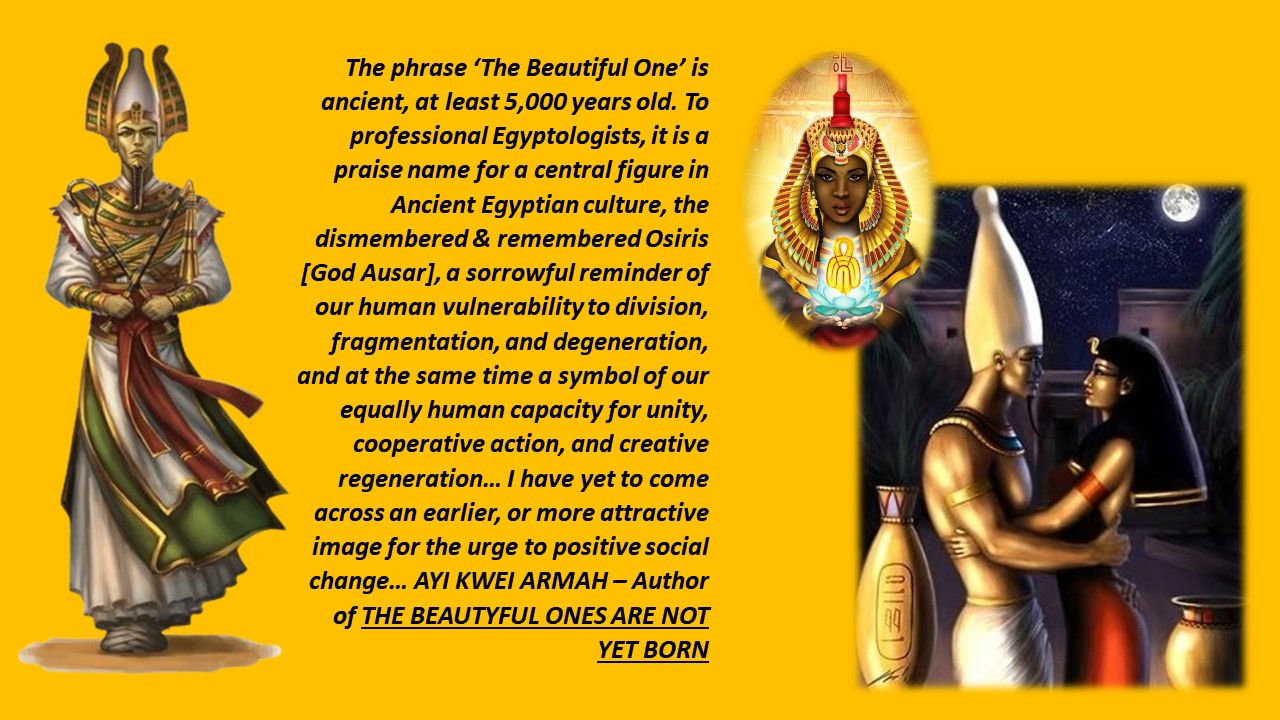 The phrase ‘The Beautiful One’ is ancient, at least 5,000 years old. To professional Egyptologists, it is a praise name for a central figure in Ancient Egyptian culture, the dismembered and remembered Osiris, a sorrowful reminder of our human vulnerability to division, fragmentation and degeneration, and at the same time a symbol of our equally human capacity for unity, cooperative action, and creative regeneration…